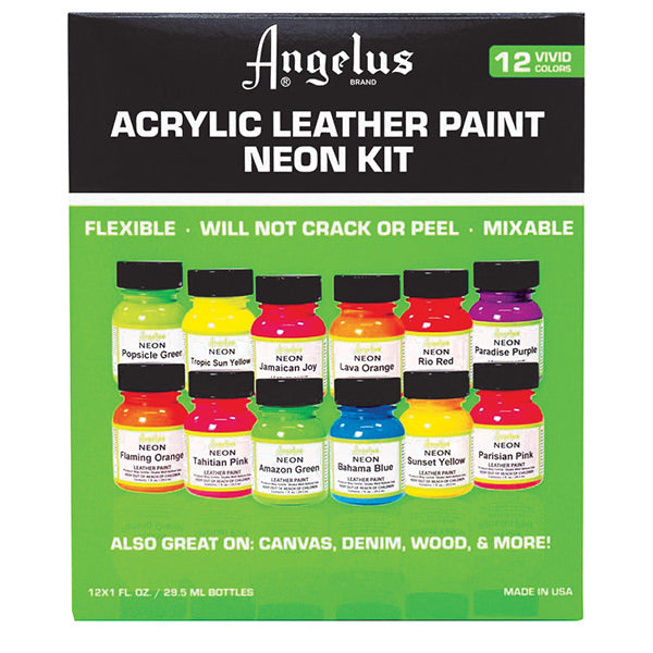 - Money-saving kit features all 12 of the vibrant neon leather paints from Angelus®