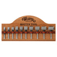 - Basketweave stamped leather strap and wood ledge keep punches in place