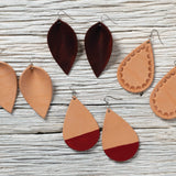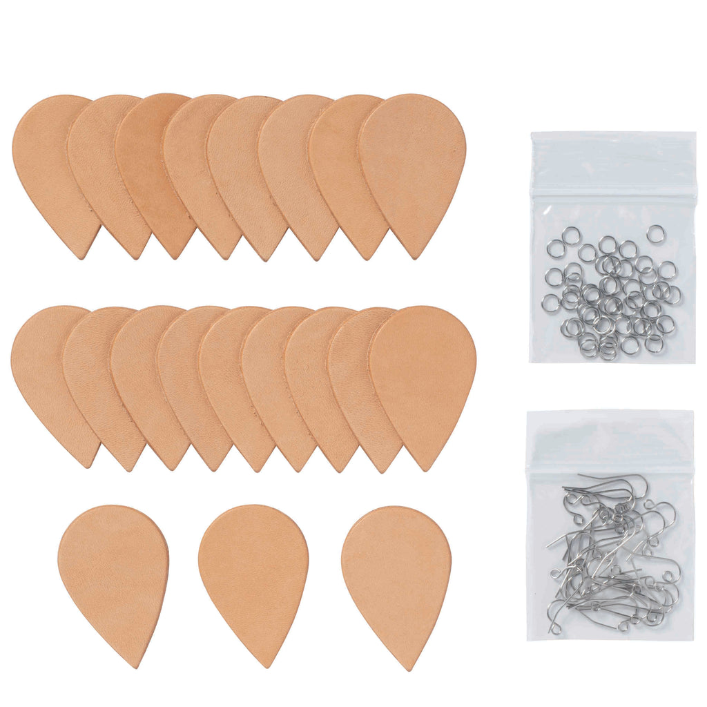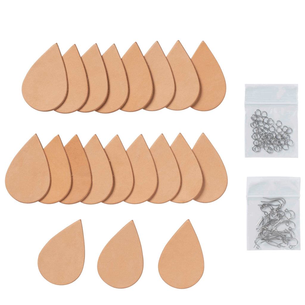 Spend less time tracing and cutting and more time decorating with this convenient kit that includes pre-cut leather pieces and hardware for 10 pairs of earrings. Perfect for gifts or production, these tear drop earring blanks are canvases for your custom art. Natural, vegetable tanned leather beautifully accepts pyrography, paint, stamps and tooling. Stainless steel hardware is ideal for sensitive ear lobes.